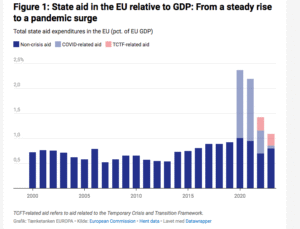 Più interessante è la prospettiva storica. Secondo il centro-studi Think Tank Europa, dal 2000 al 2020 gli aiuti di Stato sono oscillati tra lo 0,7 e lo 0,9% del prodotto interno lordo. Nel 2020, per via della pandemia, sono saliti a quasi il 2,5% del PIL. Da allora, il dato è sceso, ma rimane ben sopra l’1% del PIL.